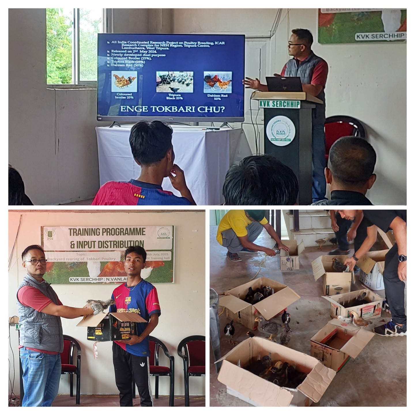 On campus training at KVK training hall, N.Vanlaiphai. 15 participants ( 10 males and 5 females) from 5 villages ( N.Vanlaiphai, Khawlailung, E.Lungdar and, Leng and Sailulak) participated. 2 weeks old Tokbari birds were distributed @ 20 per farmers.
